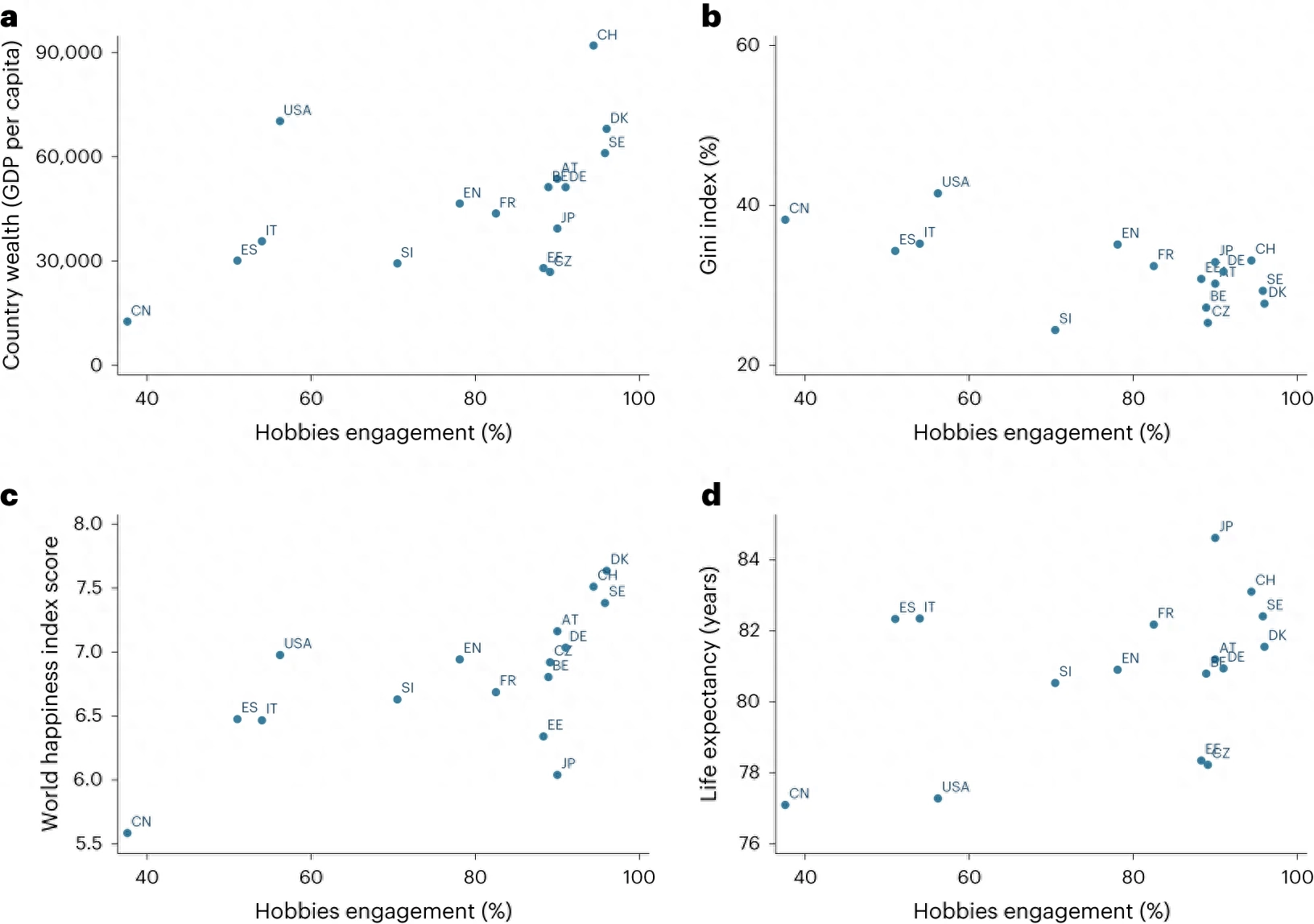 研究人员发现,不同国家表示自己有爱好的人比例差异很大,西班牙 51% 的研究参与者表示自己有爱好,而丹麦的这一比例为 96%,瑞典为 95.8%,瑞士为 94.4%。