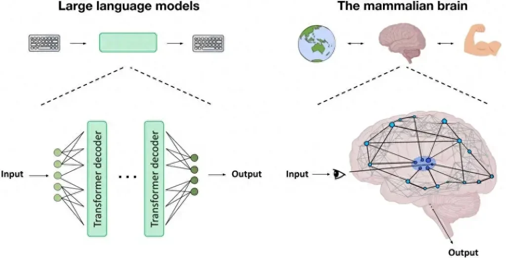 描述大型语言模型基本架构的示意图,哺乳动物大脑与大型语言模型之间的差异,左图为大型语言模型的基本结构示意图,它可以有几十个甚至一百多个以前馈方式排列的解码块。右图为丘脑皮层系统的启发式地图,该系统产生的复杂活动模式被认为是意识的基础。图片来源:Mac Shine、Jaan Aru