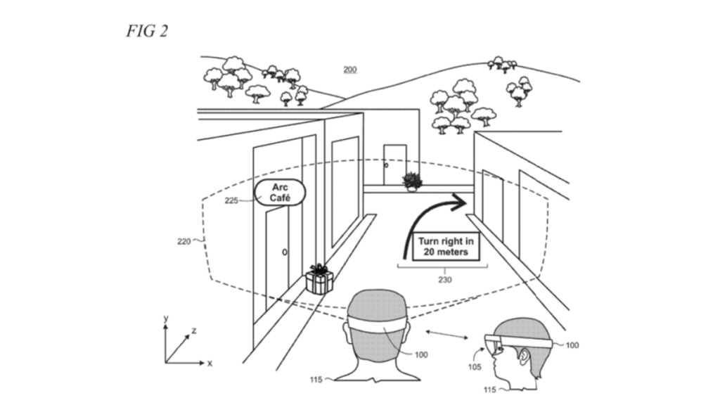 在微软展示的专利示意图中,佩戴这款头显的用户在户外行走,头显就会自动显示附近的景点、以及事物的相关信息。