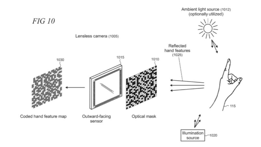 头显内部追踪系统由光学掩模、朝外的传感器和照明源组成,利用无镜头相机捕捉用户身体部位的图像,然后使用光学掩模对图像进行编码,传感器会捕获图像并将其馈送到计算机程序中,该程序可以识别加扰图像中的身体部位。