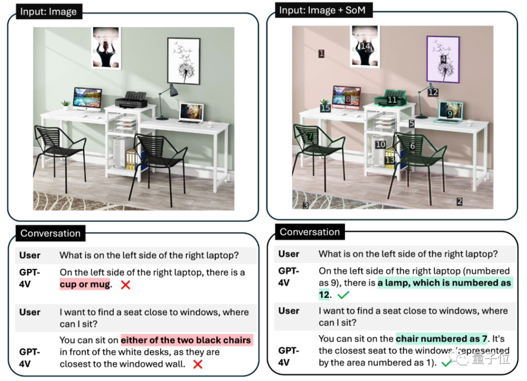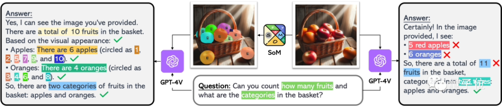 相比让 GPT-4V 直接“看图说话”,这个工具可以将图片关键细节拆分成不同的部分,并进行编号,让 GPT-4V 有的放矢: