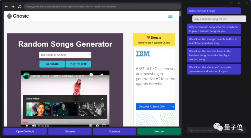 甚至还能快速摸清楚“播放音乐”的播放器网站和按钮,给自己来一段 music: