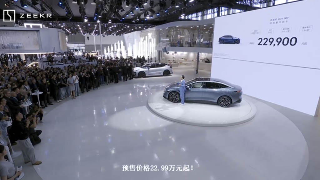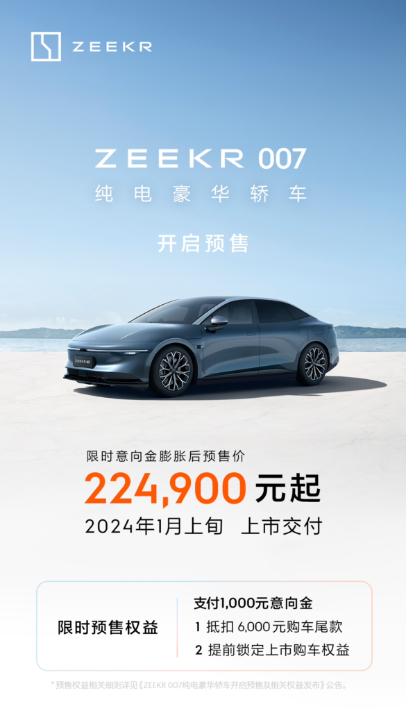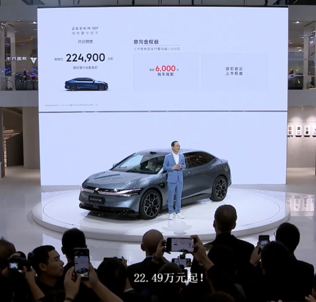 在今日的第二十一届广州国际汽车展览会上,极氪首款纯电轿车 007 开启预售,价格为 22.99 万元起,限时 22.49 万元起,2024 年 1 月上市交付。