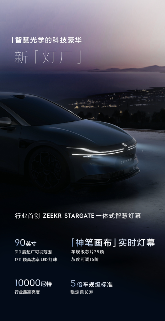 极氪 007 号称首创全球最大的 ZEEKR STARGATE 一体式智慧灯幕,搭载全球唯一 90 英寸巨幕灯带、呈现 310° 超广灯幕可视范围。