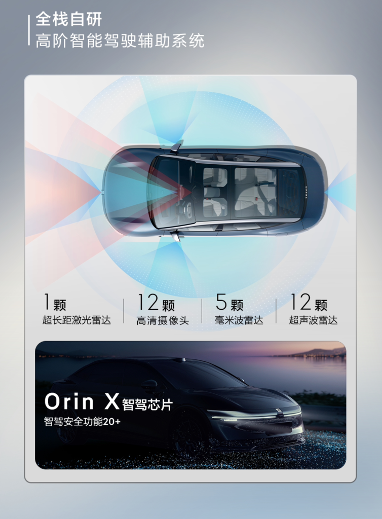 智驾方面,该车配有 1 个激光雷达、12 个高清摄像头和 5 个毫米波雷达,高速 NZP 辅助驾驶交付即开通,全国都能用。