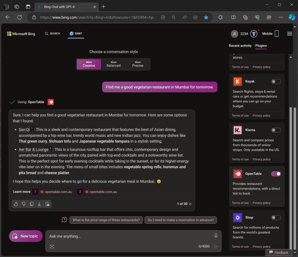 此外,这些插件现在运行速度明显变得更快了。微软此前透露,其 Bing Chat 对 AI 功能进行了基础设施升级,这似乎解释了插件现在表现更好的原因。