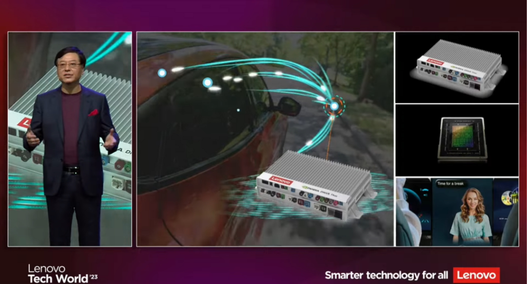 杨元庆在演讲时介绍了联想车计算的产品布局,他指出,未来智能汽车更像是轮子上的超级 PC,对汽车性能标准的衡量也从马力变成了算力,联想车计算的域控产品将支持智能座舱、自动驾驶和智慧屏幕等,基于汽车场景的大模型也将化身智能伴侣,了解用户、帮助用户和陪伴用户。