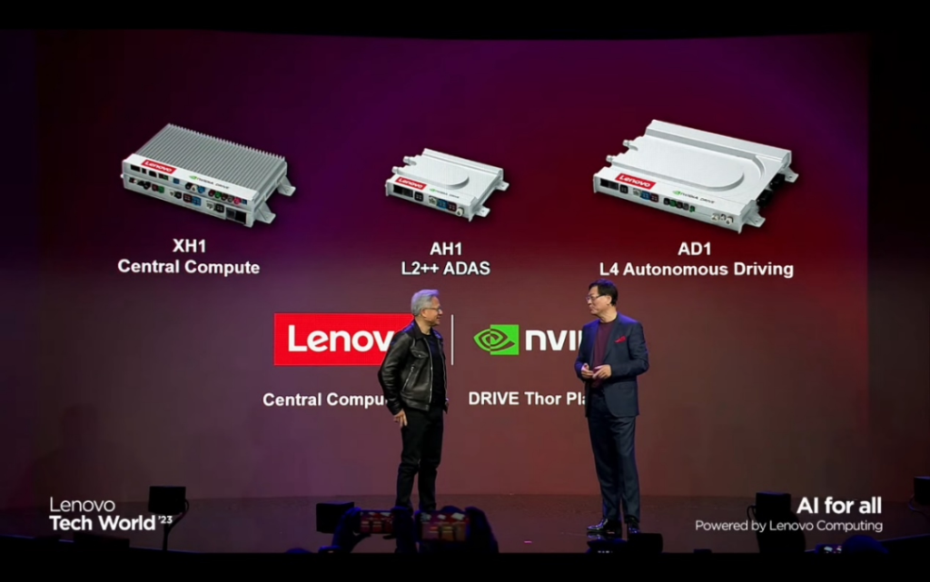 英伟达创始人、首席执行官黄仁勋也出现在大会上,为联想域控制器新品站台。