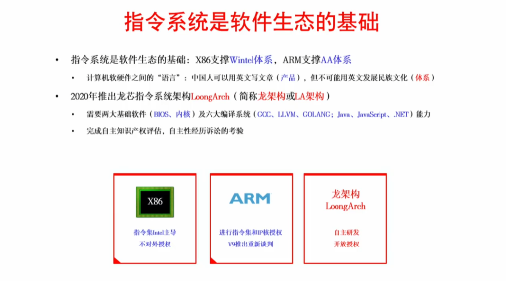 发布会一开始,龙芯掌门人胡伟武再次聊到了,龙芯这么多年,为什么要坚持自研指令集架构。