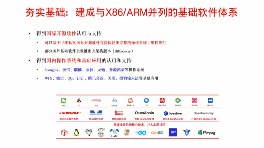 首先龙芯将自家的 LoongArch 进行了开源,开发者可以直接在上面搭建操作系统,目前已经支持了包括统信、麒麟、欧拉、开源鸿蒙在内的多类系统。