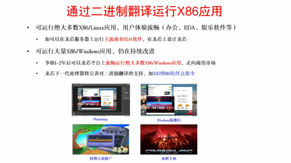 与此同时,像是 QQ、微信、WPS、网易云音乐、腾讯视频等应用,也慢慢在拓展和入驻。相信假以时日,就能在龙芯 CPU 上体验到一个较为基础的日常软件生态。光靠大厂和开发者们短时间内的用爱发电或爆肝开发,在应用数量上肯定还是没法和主流的Windows、macOS 来相比的。所以龙芯还想到了一招——通过二进制翻译来运行 X86 应用。