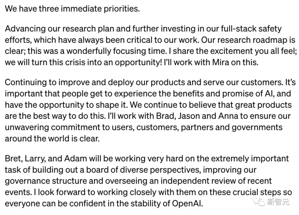 在写给 OpenAI 全体员工的公开信中,他清晰地为公司设定了短期内的三个目标: