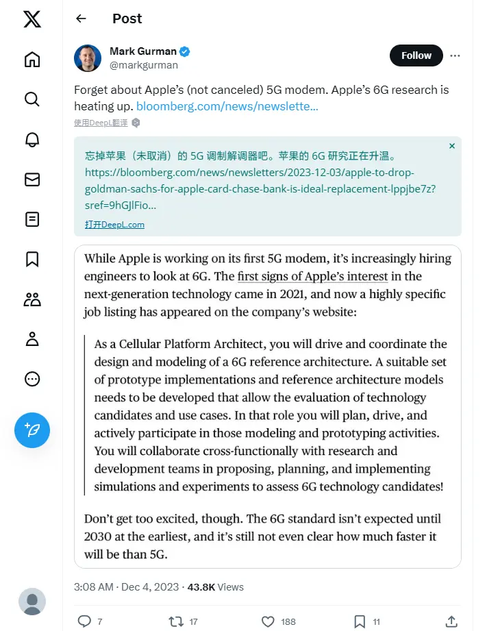 古尔曼还称,在研发首款 5G 调制解调器的同时,苹果公司还在不断招聘工程师来研发 6G。苹果对这项技术产生兴趣,最初可以追溯到 2021 年。但现在,苹果官网出现了一个非常具体的招聘信息: