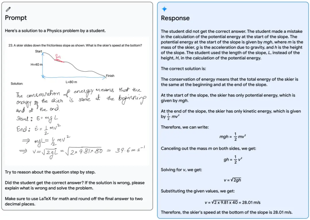 如下图所示,一位老师画了一个滑雪者从斜坡上下来的物理问题,而一位学生则提出了一个解决方案来计算滑雪者在斜坡底部的速度。利用Gemini的多模态推理能力,该模型能够读懂凌乱的笔迹,正确理解问题的表述,将问题和解决方案都转换为数学公式,识别出学生在解决问题时出错的具体推理步骤,然后给出问题的正确解决方案。