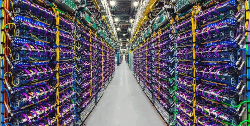 Google 数据中心内的一排 Cloud TPU v5p AI 加速器超级计算机。