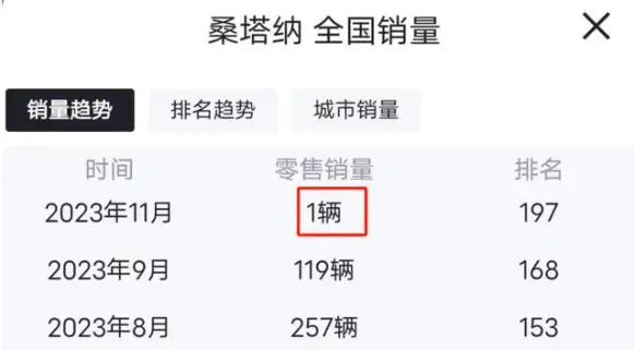 有数据显示,在 2023 年 11 月,桑塔纳的销量仅为 1 辆,实在是令人唏嘘。