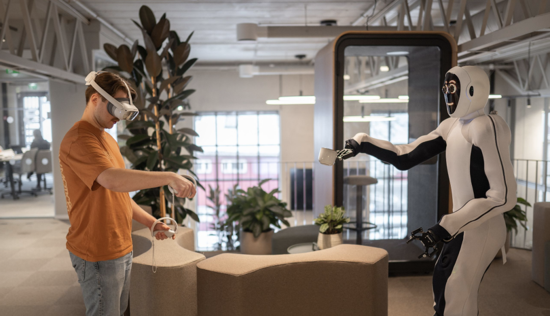 借助 VR 技术,1X 操作员在工作室中进行远程操作,来训练机器人完成任务,从而有效地将人类智能与人工智能效率结合起来。