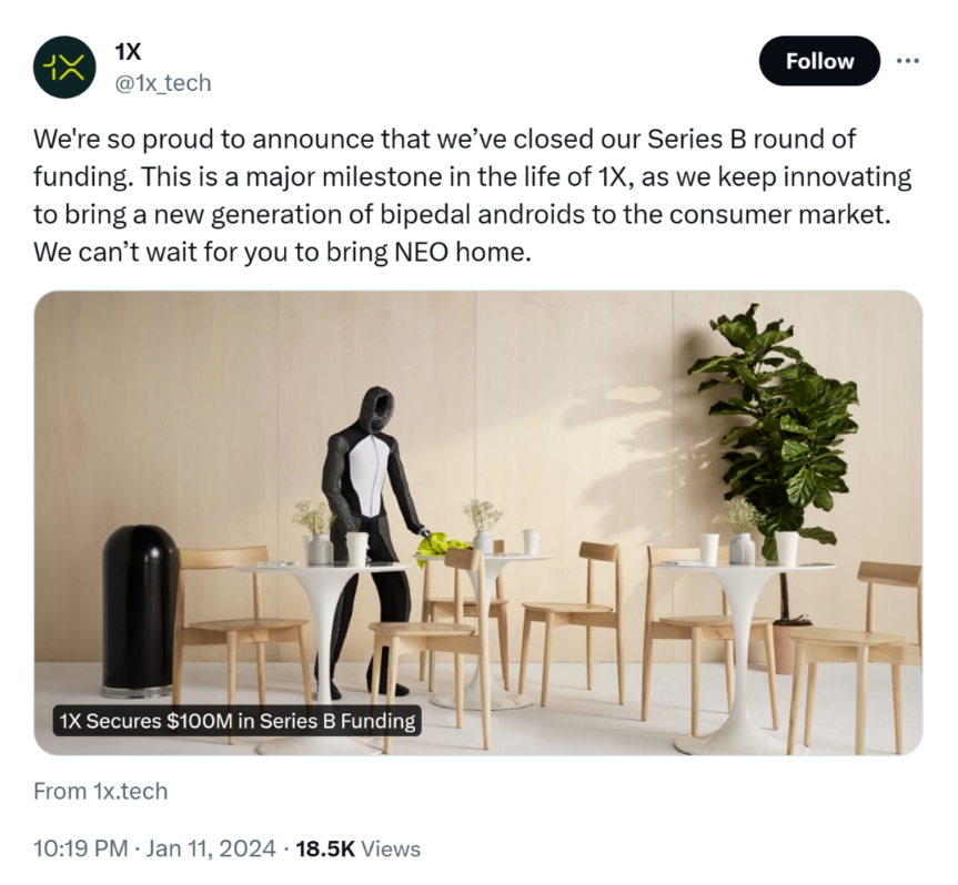 新年伊始,来自挪威的人形机器人初创企业 1X Technologies(简称:1X)就宣布完成了 1 亿美元的 B 轮融资。