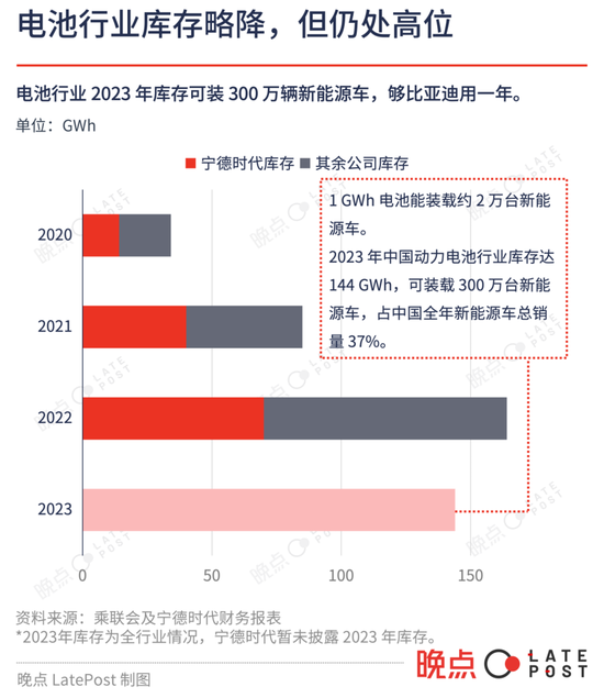 到 2023 年底,中国电池公司的库房里堆了 144 GWh 电池,可装载约 300 万辆新能源车,占中国全年新能源车总销量的 37%,够全球卖车最多的新能源车企比亚迪用一年。