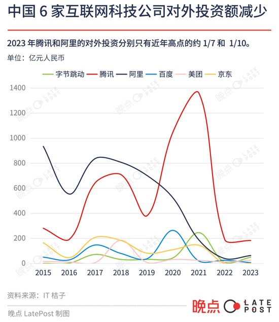 腾讯 2023 的投资额是 2021 年顶峰时的 1/7,阿里则不足其上一个高峰 2017 年时的 1/10;收入 7000 多亿元人民币的字节跳动,对外投资不到 50 亿元人民币。