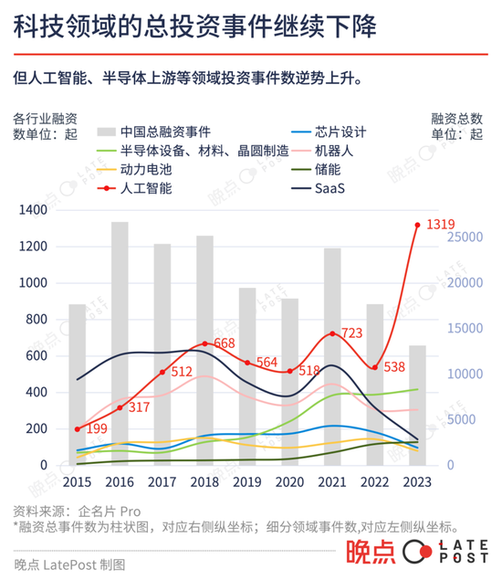 因底层技术进展和 ChatGPT 的爆火,AI(人工智能)尤其是大语言模型成为 2023 年最大的科技投资亮点,AI 领域融资事件数比前一年增长 145%。