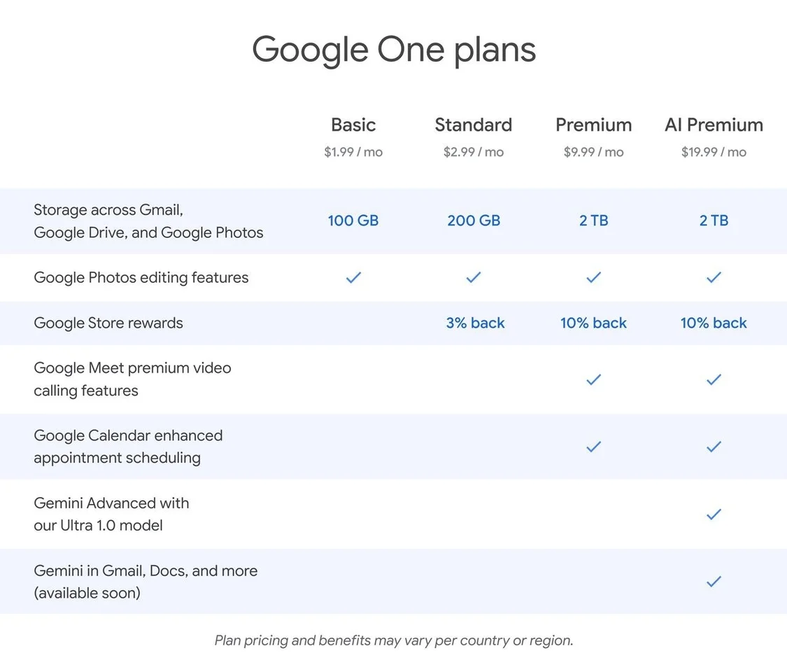 在 Google 推出新的 AI Premium 档位之前,Google One 原本有三个档位,每月 1.99 美元,每月 2.99 美元和每月 9.99 美元。新的 AI Premium 档位,虽然看起来是 19.99 美元,其中将赠送 9.99 美元档位的全部 Google One 服务。