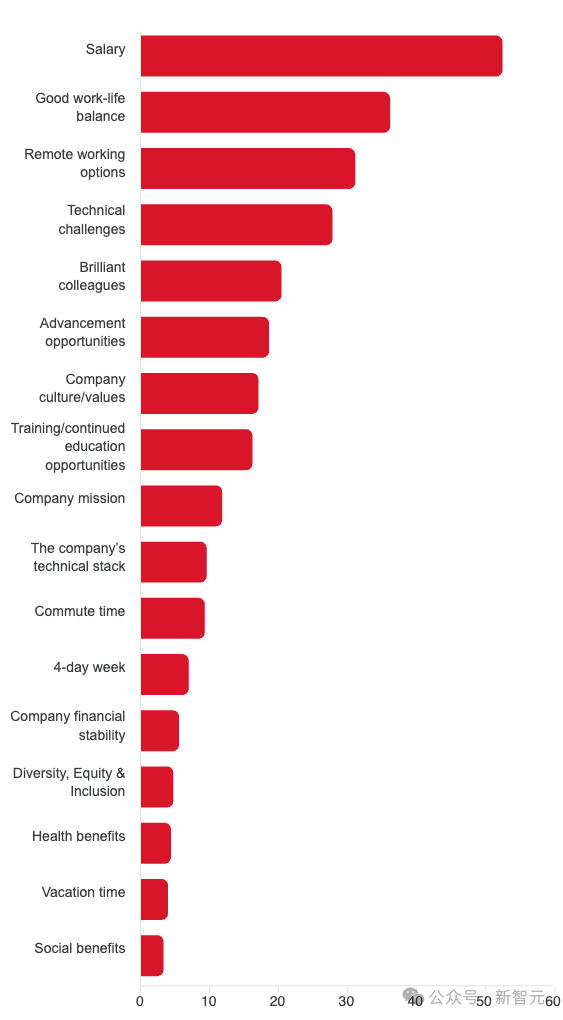 相对而言,通勤时间、每周 4 天上班、休假时间、社会福利等,则被放在排名最末尾的位置。