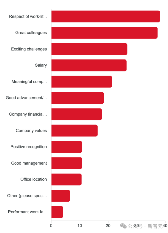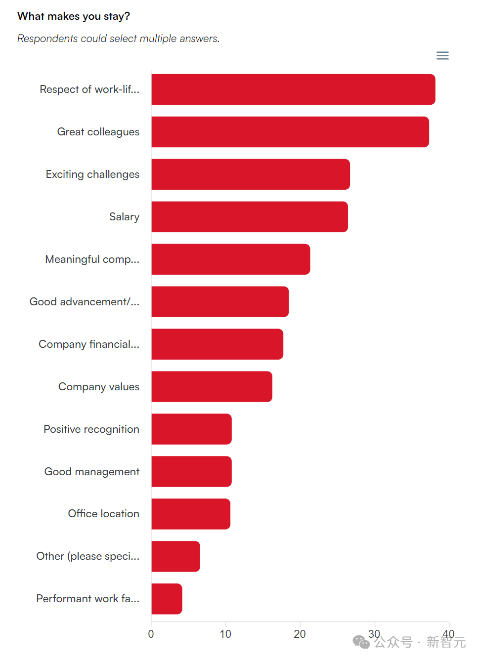 工作 / 生活的平衡 (38%)、优秀的同事 (37%) 和令人兴奋的挑战 (27%) 是吸引员工留在原公司的主要原因,薪水都只占到第四位。