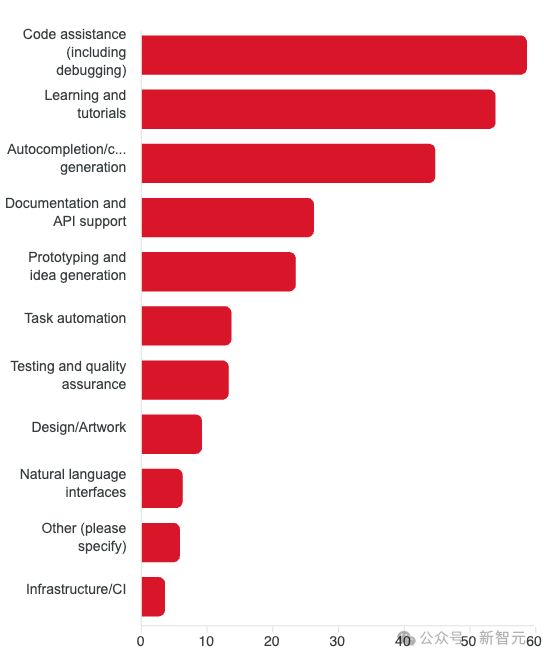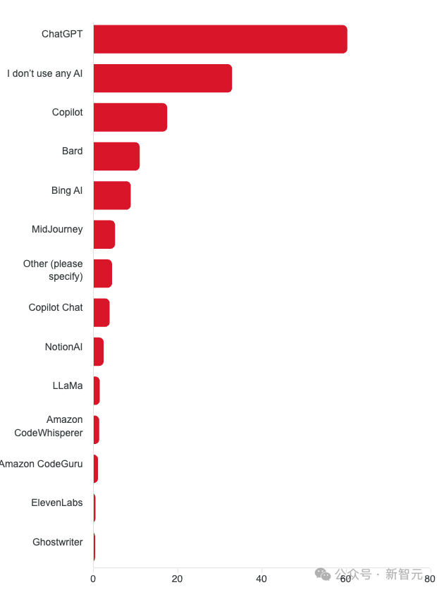 而作为最出圈的 AI 工具,ChatGPT 也是被开发者用得最多的,比例高达 60%。