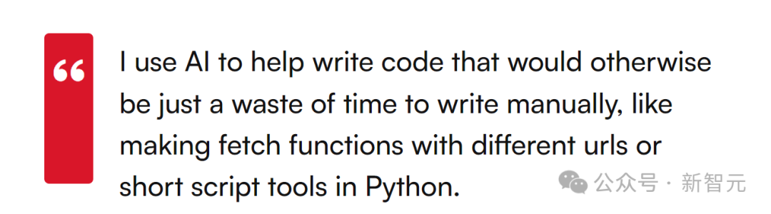 一位匿名采访者表示:我写代码时会用 AI 来辅助,手写代码只会浪费时间,比如在 Python 中使用不同的 url 或短脚本工具写 fetch 函数。