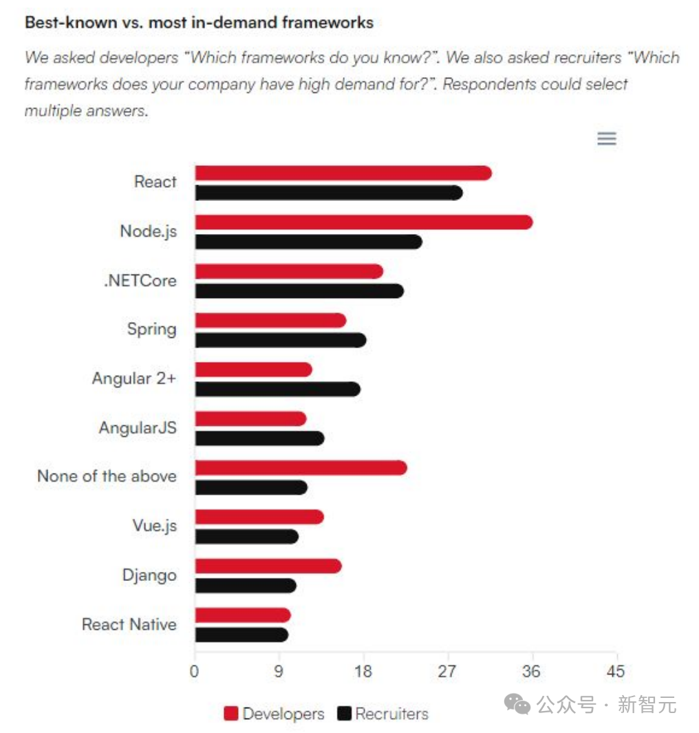 过去的一年里市场对于对高级开发人员的需求减少了:去年,31% 的招聘人员希望聘请高级人才。今年这一比例已降至 18%。