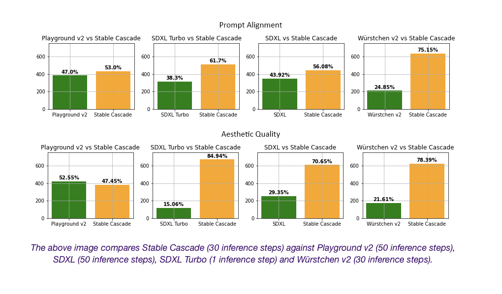Stability AI 同时将 Stable Cascade 模型与 Playground v2、SDXL、SDXL Turbo、Würstchen v2 等业界文生图竞品进行比较,号称无论是提示词对齐(Prompt Alignment)还是在生成的图片细节上,Stable Cascade“几乎都是表现最佳的模型”。而在推理速度方面,即便 Stable Cascade 最大的模型比 Stable Diffusion XL 多出 14 亿参数,仍然具有更快的推理速度。
