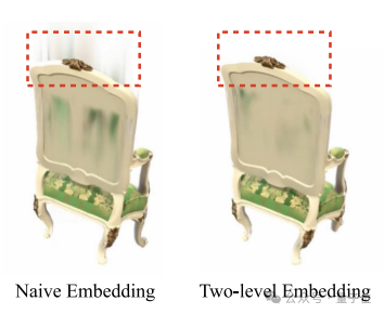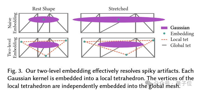 另外,他们还注意到,简单的嵌入会导致高斯内核出现一些尖峰伪影的问题,因此提出了一种两级嵌入方法,每个高斯核被嵌入到一个局部四面体中,局部四面体的顶点被独立嵌入到全局网格中。