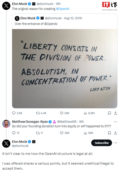 2 月 19 日消息,埃隆・马斯克今日在 X 平台与网友互动时表示,他曾被 OpenAI 授予股份,但由于担心合法性问题,他最终并未接受。