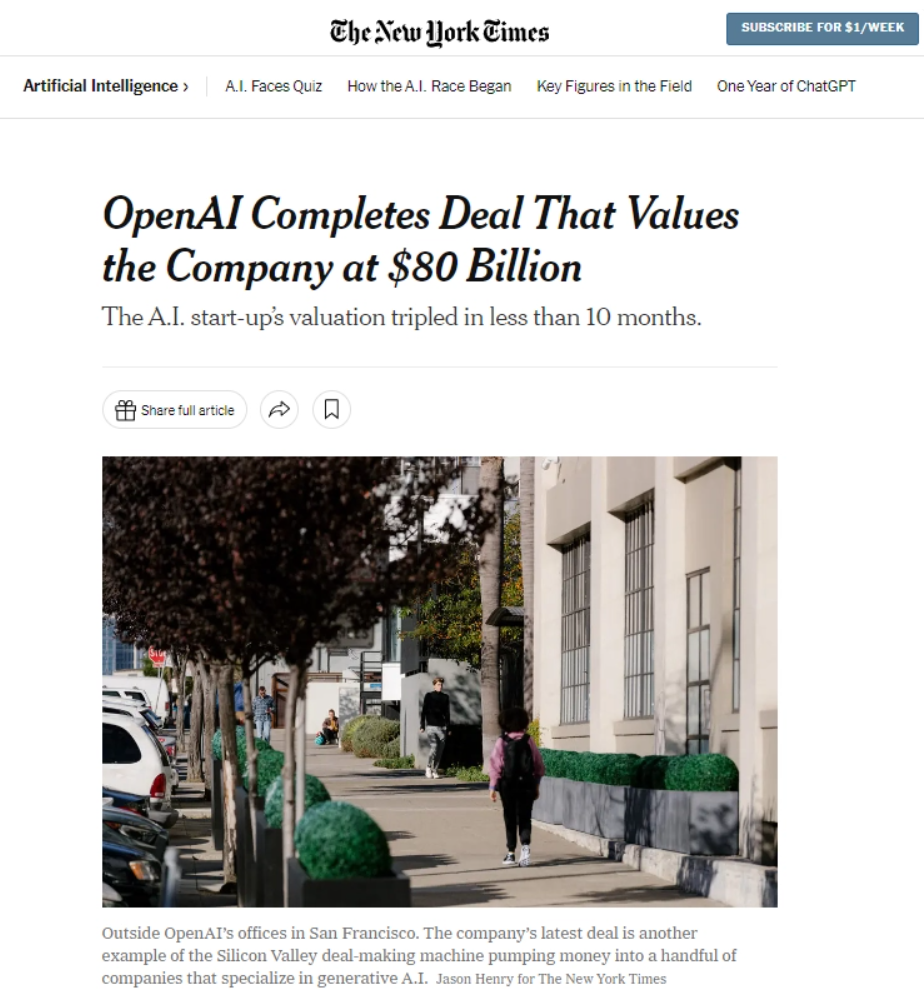 据《纽约时报》当地时间周五(16 日)报道,三位知情人士称 OpenAI 已经完成了一项交易,使其在不到 10 个月的时间内估值几乎翻了三倍,达到或超过 800 亿美元(IT之家备注:当前约 5768 亿元人民币)