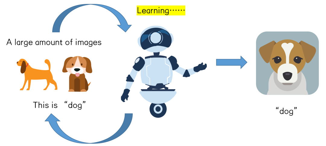 举个例子,如果我们想让计算机看到狗时能判断出是狗,就需要给计算机展示大量狗的图片,同时告诉它这就是狗。