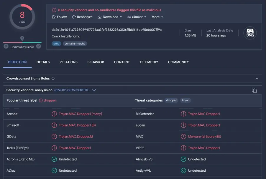 Atomic Stealer 新变种依然通过各种“破解版”应用分发,隐藏在 .dmg 文件中,而且可以躲过苹果 macOS 系统的安全审查。用户安装这些破解版应用之后,就会同步安装新变种。