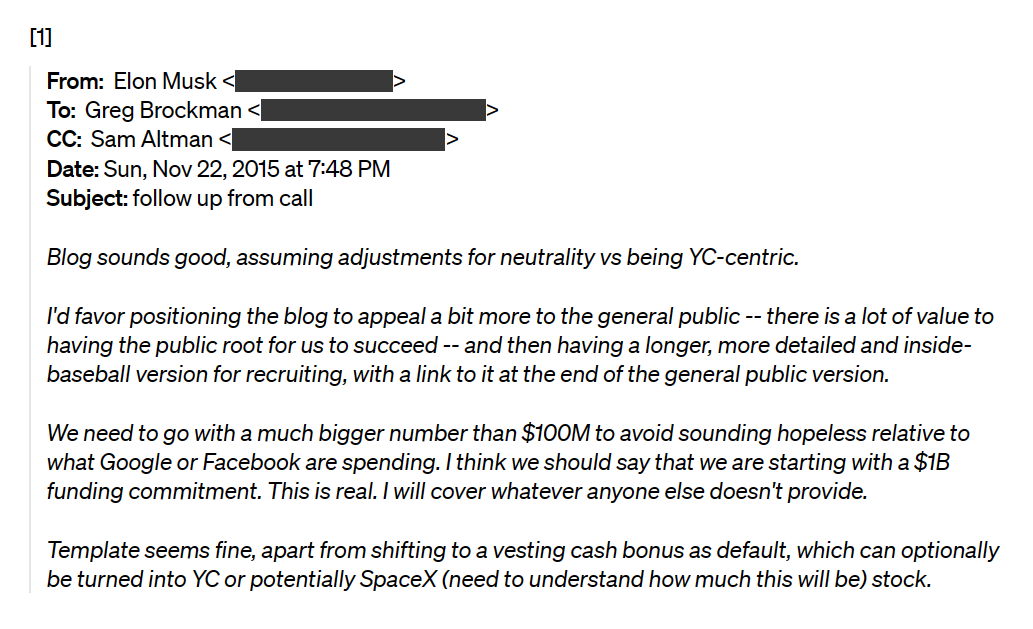Greg Brockman 和 Sam Altman 在 2015 年底创办 OpenAI 时,最初计划筹集 1 亿美元。马斯克则在一封电子邮件中表示:“我们需要提供比 1 亿美元更多的资金…… 我认为我们应该说从 10 亿美元的资金承诺开始…… ”。