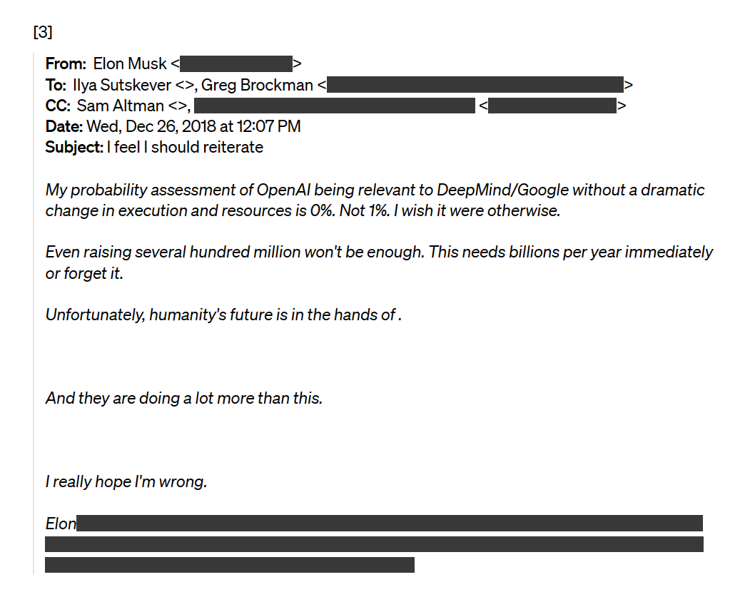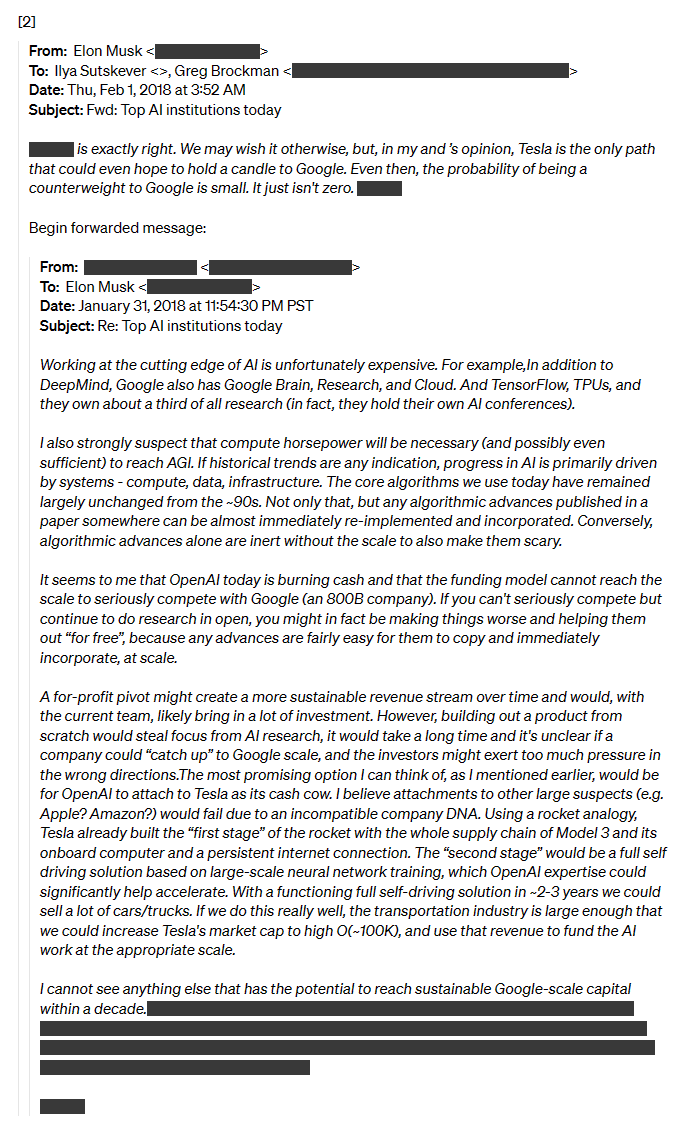2018 年 2 月上旬,马斯克向 OpenAI 团队转发了一封电子邮件,建议 OpenAI 应该“将特斯拉作为其摇钱树”,并评论说这是“完全正确的…… 特斯拉是唯一有希望与谷歌相媲美的道路。即便如此,成为谷歌制衡的可能性也很小,只是不为零”。