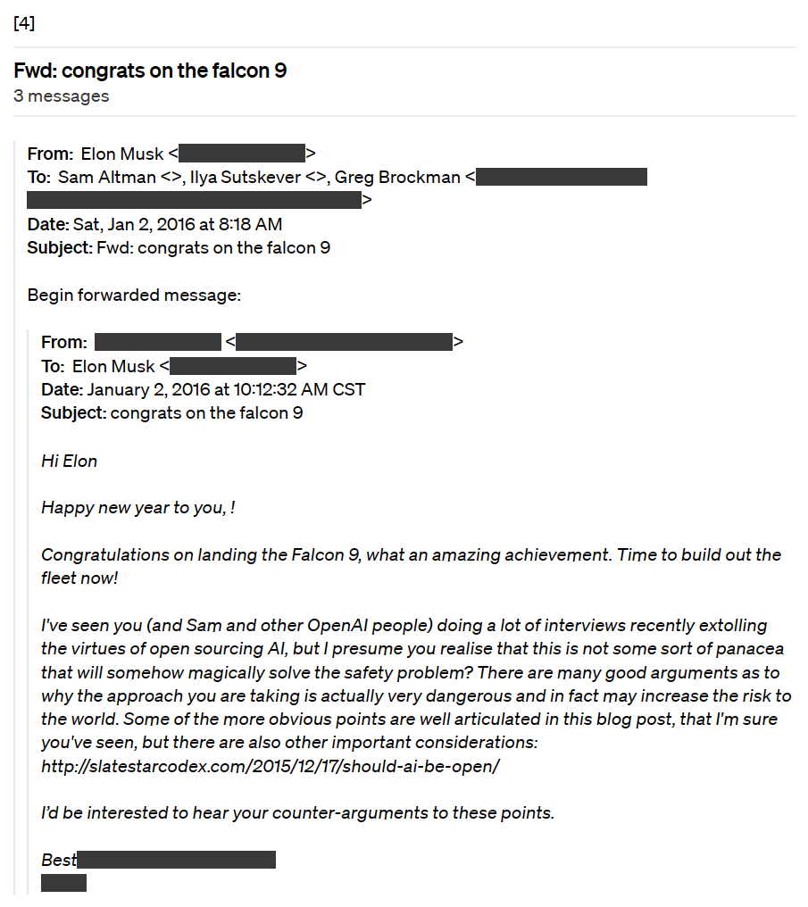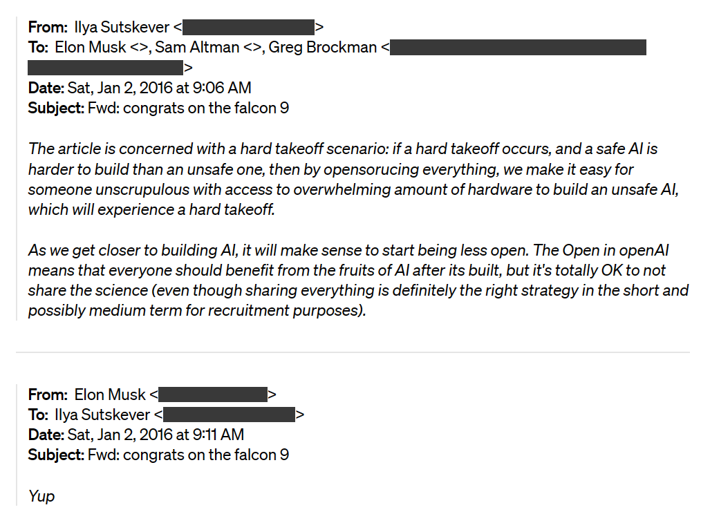 OpenAI 还称,马斯克明白这一使命并不意味着开源 AGI。OpenAI 首席科学家 Ilya Sutskever 在 2016 年的一封邮件中对马斯克称:“随着我们越来越接近构建人工智能,开始减少开放是有意义的。OpenAI 中的开放意味着每个人都应该从 AI 构建后的成果中受益,但不分享科学也是完全可以的……”,马斯克则回复称:“是的。”