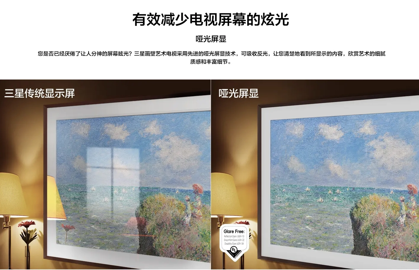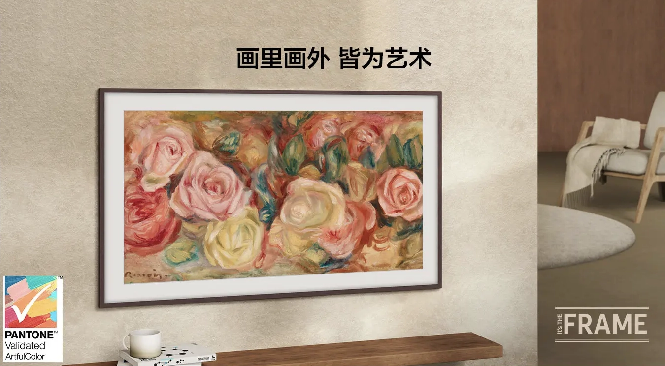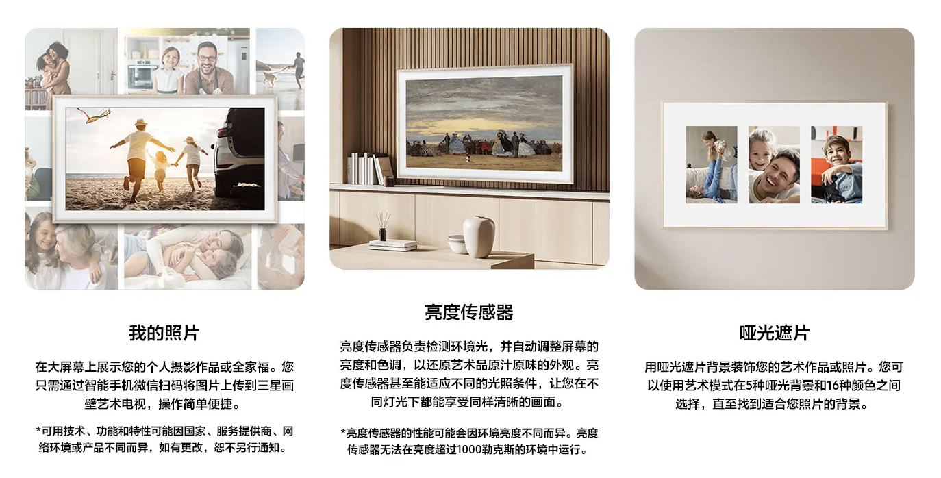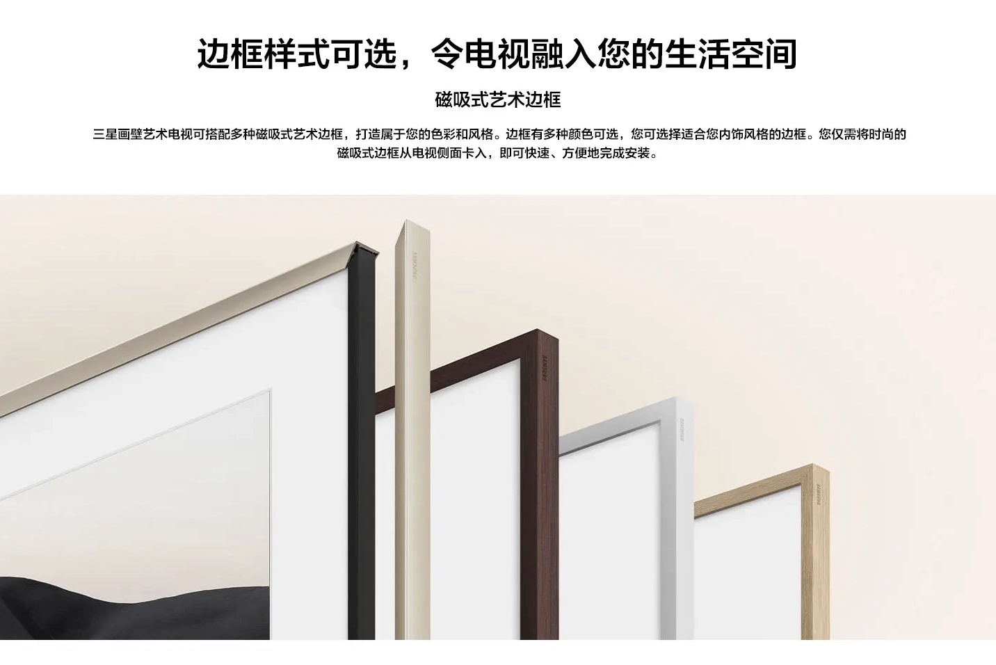 此外,系列电视整体机身厚度 26.9 mm,配备 40W 扬声器(号称改进了立体环绕声效果),搭载 TIZEN 系统,并可选配多种磁吸式艺术边框,同时新增“哑光遮片”照片集锦模式。