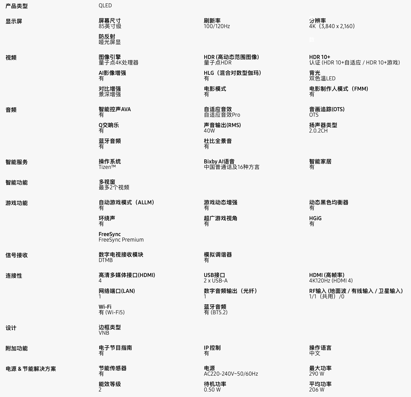 据介绍,系列电视配备哑光 QLED 3840×2160 分辨率量子点面板,采用双色温 LED 背光,内置亮度传感器,可智能检测环境光线,自动调节屏幕亮度和色调。