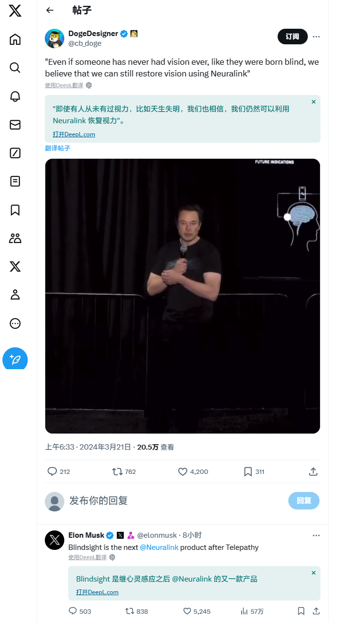 3 月 21 日消息,北京时间今日,马斯克在 X(推特)上发文宣布,继“心灵感应”(Telepathy)之后,其脑机接口公司 Neuralink 的下一个产品将是“盲视”(Blindsight)