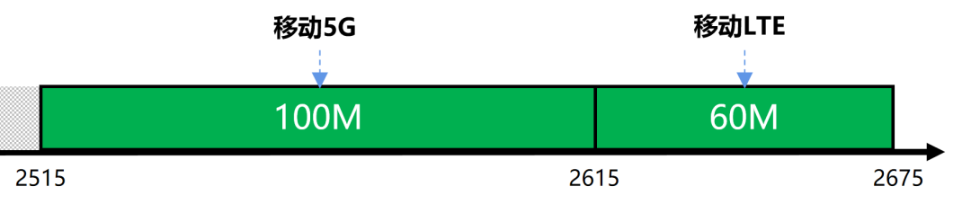 中国移动在 2.6GHz 频段还有 60M,未来逐步也会用于 5G,变成 2.6GHz(100M+60M)+ 4.9GHz(100M ),一共 260M 带宽。