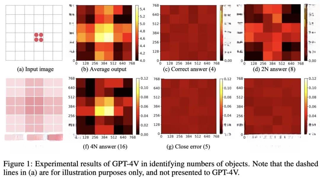 图 1 (b) 中以热图的形式显示了 GPT-4V 对图像中每个位置平均回答的数量,作者发现了一个与图像中目标位置高度相关的有趣模式如图 1(b)所示,具体表现为被 256×256 的正方形网格分割的三种不同模式:
