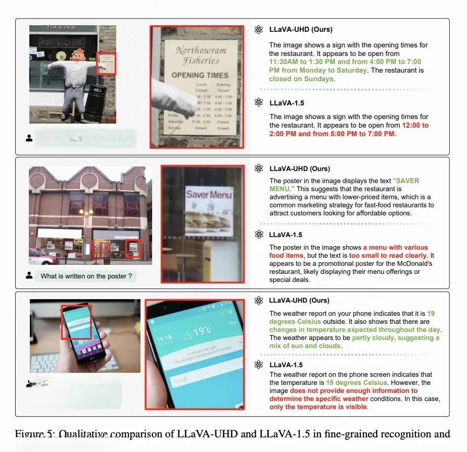 为了更直观地展示 LMM 在处理高分辨率图像方面的能力,在图 5 中提供了 LLaVA-UHD 和 LLaVA-1.5 的定性结果。可以看到,LLaVA-UHD 可以正确识别课表上的密集内容,小海报上的文字以及手机上的图标和文字,实现了细粒度的识别和推理。