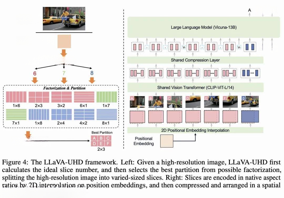 LaVA-UHD 包括三个关键部分:一种图像模块化策略,将原始分辨率的图像分成更小的可变大小的切片,以便进行高效和可扩展的编码;一个压缩模块,进一步压缩来自视觉编码器的图像 tokens,一个空间装饰模式,用于为 LLMs 组织片段 tokens。