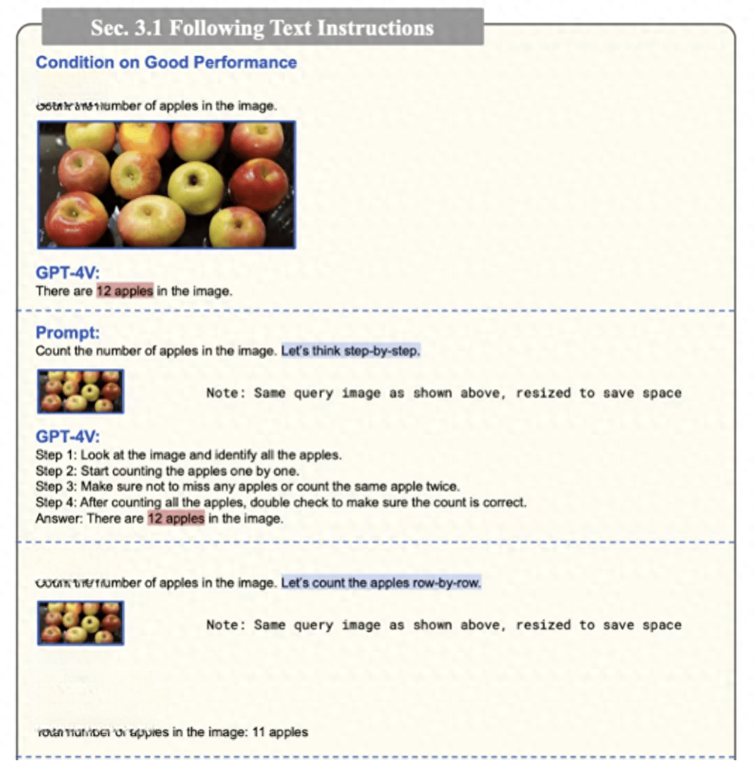 然而,近期很多工作发现 GPT-4V 在很多基本能力上却意外的出现短板。例如,在微软一篇长达 166 页的技术报告《The Dawn of LMMs:Preliminary Explorations with GPT-4V (ision)》中,作者发现,对于一个不太复杂的图像中的苹果数量,GPT-4V 竟然怎么数也数不对。