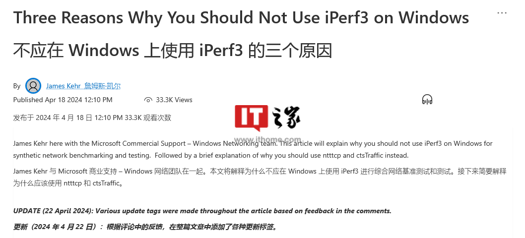 4 月 24 日消息,微软公司近日发布博文,推进 Windows 10、Windows 11 用户尽量不要使用 iPerf3 来测试网络性能,推荐使用 ntttcp 和 ctsTraffic 两款综合网络基准测试工具。