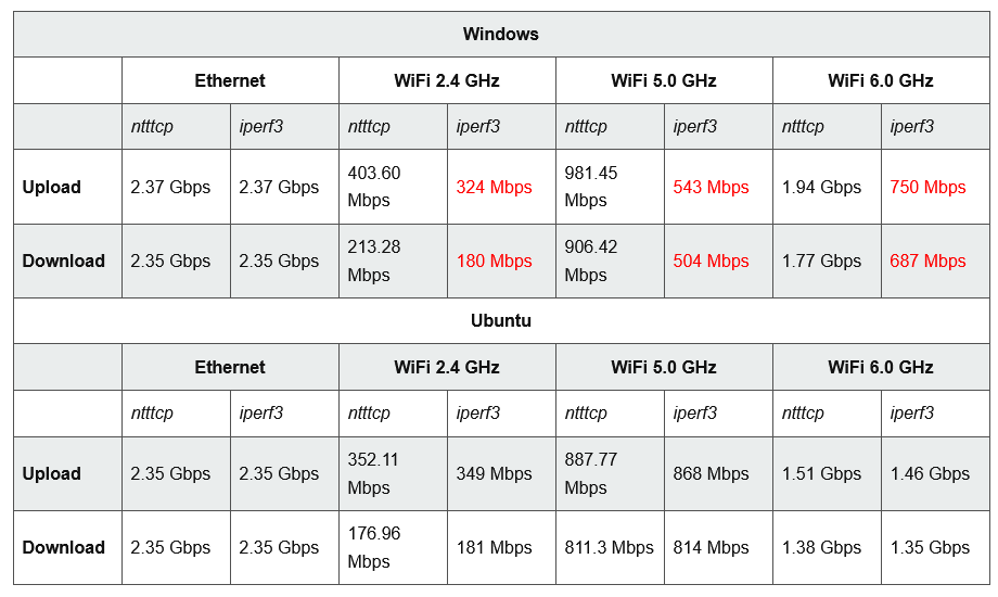 国外科技媒体 liliputing 进行了测试,在 Windows 和 Ubuntu 系统中对比了 ntttcp 和 iperf3 吞吐量测试结果: